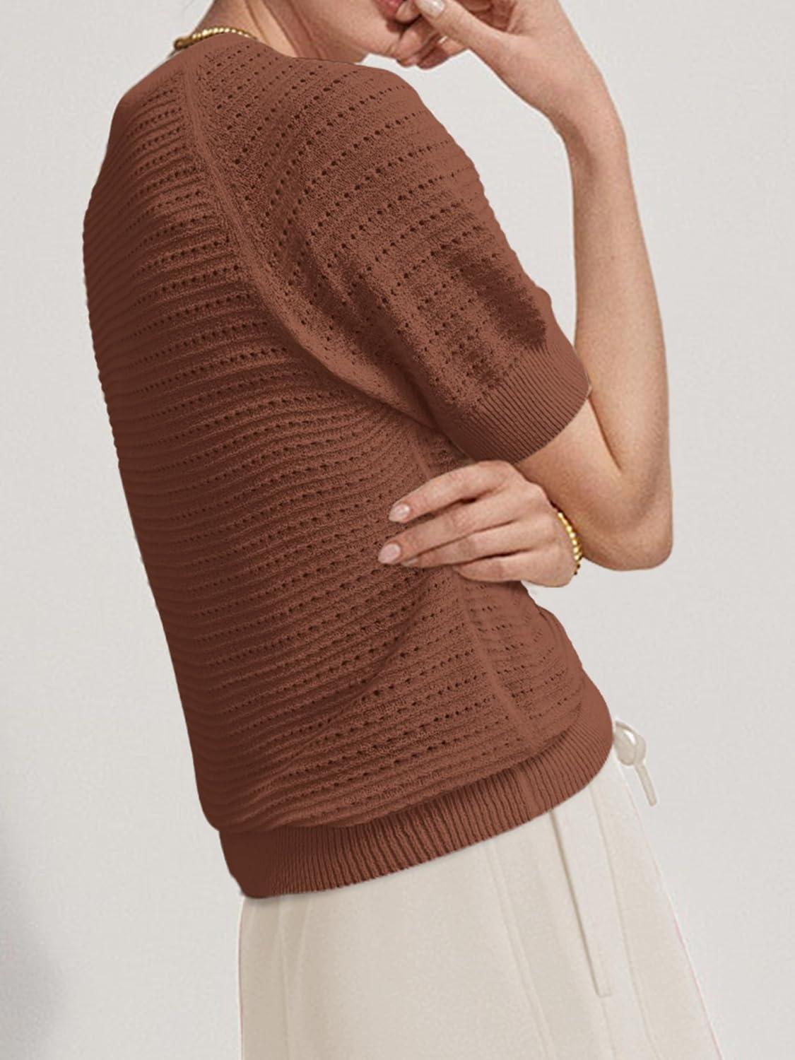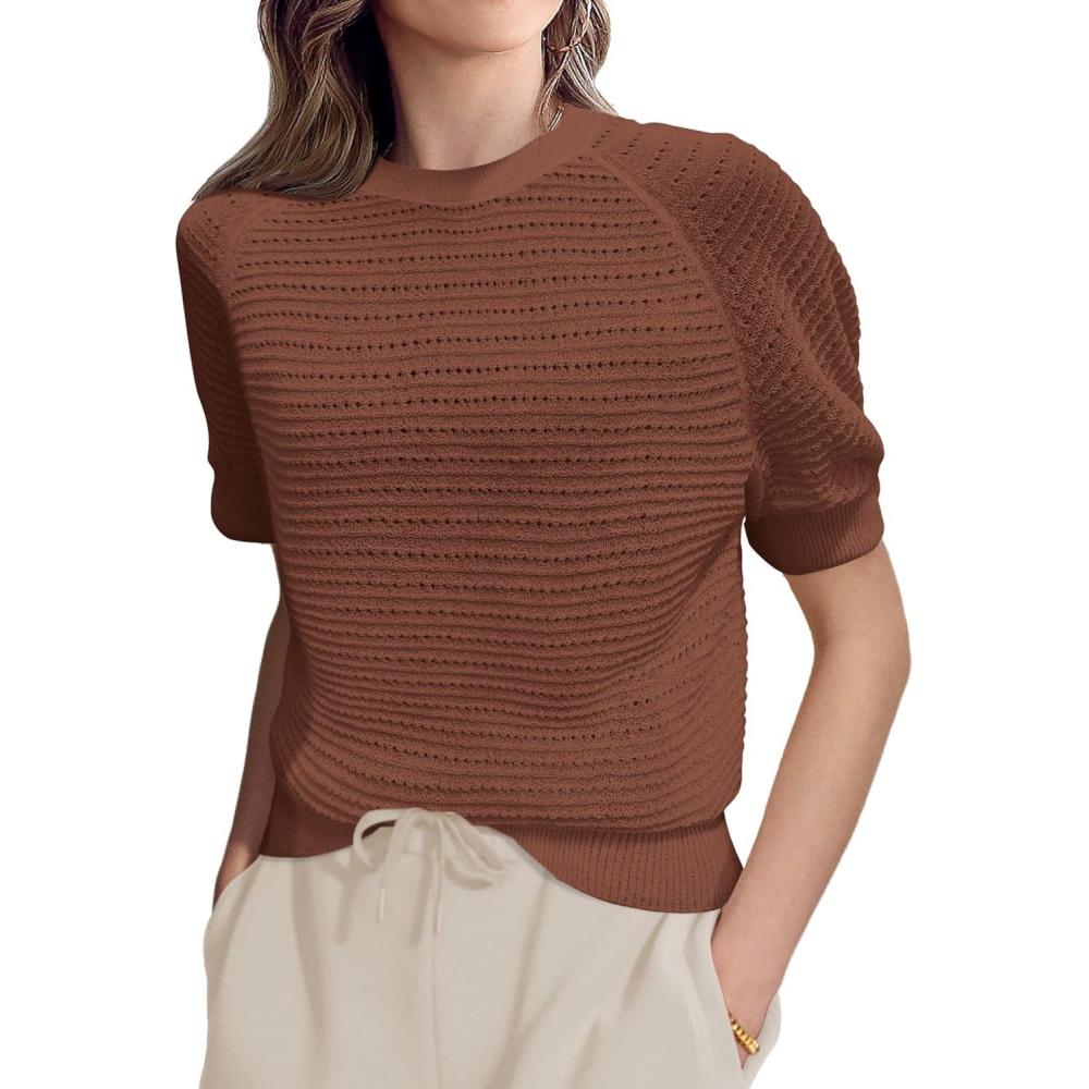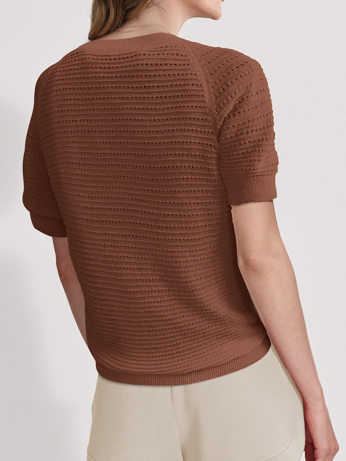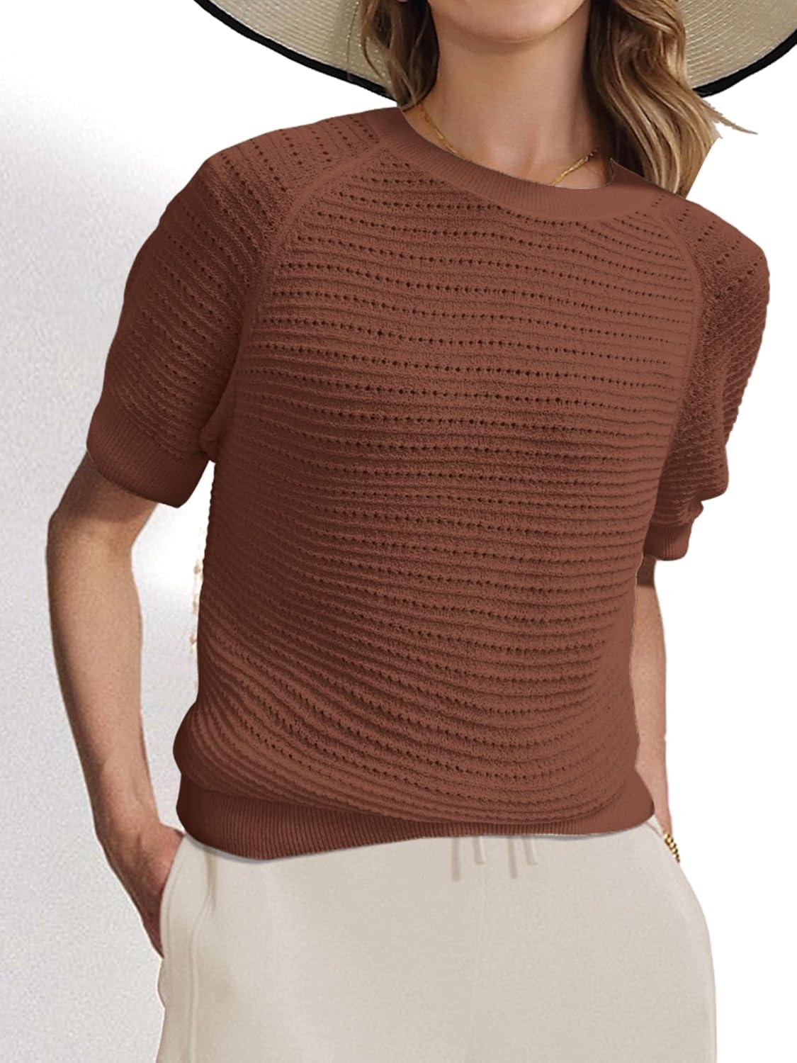 SuperPrity Crochet Tops for Women Summer Short Sleeve Hollow Out Sweater Beach Swimsuit Cover Ups 2025 Trendy Sexy Top(Brown)